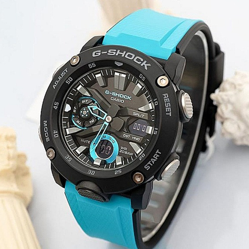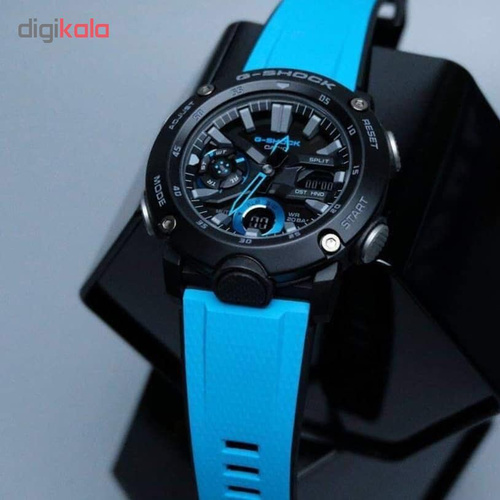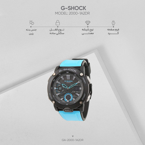 ساعت مچی عقربهای کاسیو مدل GA-2000-1A2DR یکی از اعضای خانواده G-Shock است. که در کنار طراحی ساده و جذاب از کارایی بالایی برخوردار است.یک ساعت اسپرت با طراحی و رنگبندی متفاوت است. یکی از نکاتی که در نگاه اول در مورد این ساعت به چشم می آید ترکیب رنگ مشکی و آبی ساعت که به آن یک ظاهر اسپرت و جوان پسندانه بخشیده است به طوری که میتوانید به راحتی آن را در استایل کژوال و روزمره خود به کار ببرید. همچنین با داشتن قاب و بند رزین ساعت مقاومت و انعطاف و راحتی خوبی ایجاد میکند. از امکانات این ساعت میتوان به کورنوگراف،داشتن دو موتور آنالوگ و دیجیتال، آلارم و مقاومت در برابر آب تا عمق 200 متر اشاره کرد.در واقع استایل این مدل ساعت مچی مردانه کاسیو جی شاک از نوع دیجیتال / آنالوگ است و با توجه نوع استایل (اسپرت)، نوع بند (رابر)، میزان ضدآبی (200 متر) و مقاومت بالایی که در برابر ضربه دارد این محصول را به یک ساعت ورزشی کامل تبدیل کرده است.همچنین این ساعت مچی دارای تقویم کامل روز و شب، روزشمار و ماه شمار است و امکانات ساعت جیشاک شامل زنگ هشدار، تایمر شمارش معکوس، نور پشت صفحه و کورنوگراف است. همچنین این ساعت دارای نشانگر ساعت جهانی است که میتوانید به وسیله آن زمان پایتختهای جهان را مشاهده کنید.